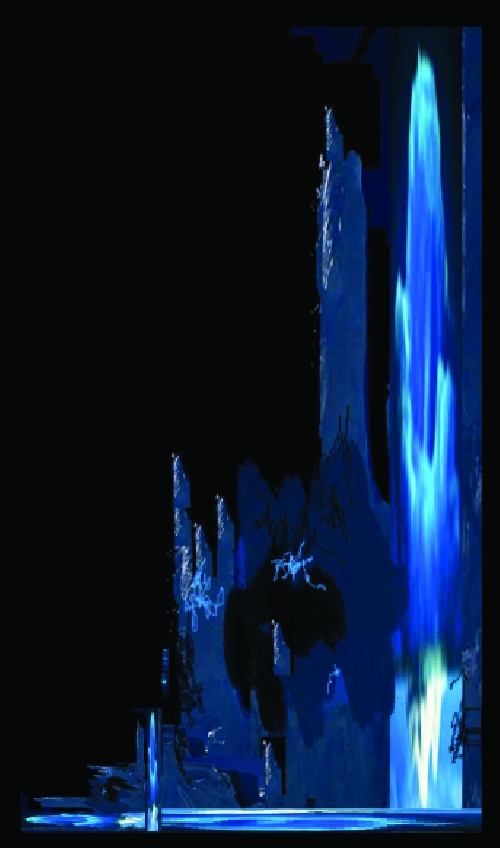 Aux yeux d'Unn, un monde ensorcelé se révélait, composé de monticules, de voûtes, de coupoles givrées, de courbes harmonieuses et de dentelures complexes. Rien que de la glace, sur laquelle l'eau, éclaboussant sans cesse, continuait son œuvre de construction. Les glaces, ayant barré certaines parties de la cascade, d'autres branches s'étaient créées, où se forgeaient de nouvelles improvisations. Malgré l'absence du soleil, c'était un éblouissement de couleurs, des jaillissements de bleus et verts. Un froid de mort y régnait.